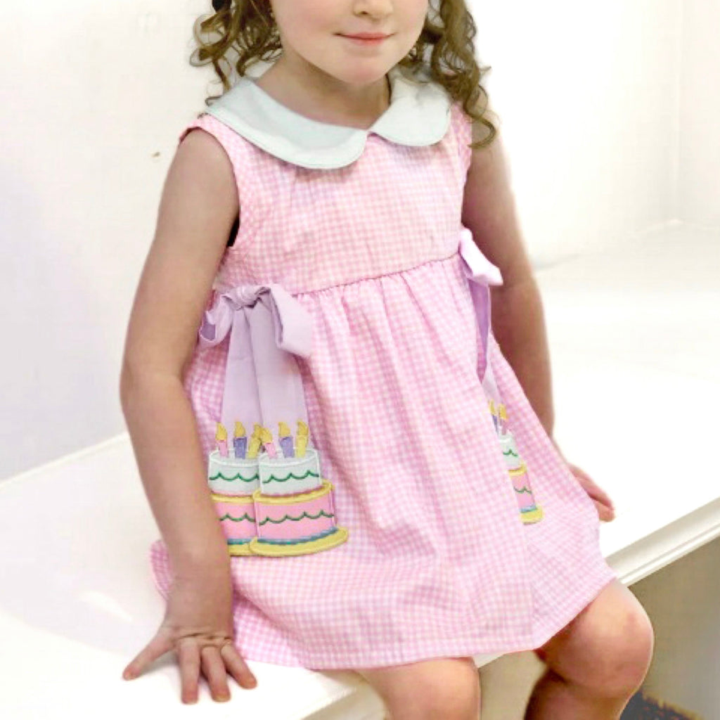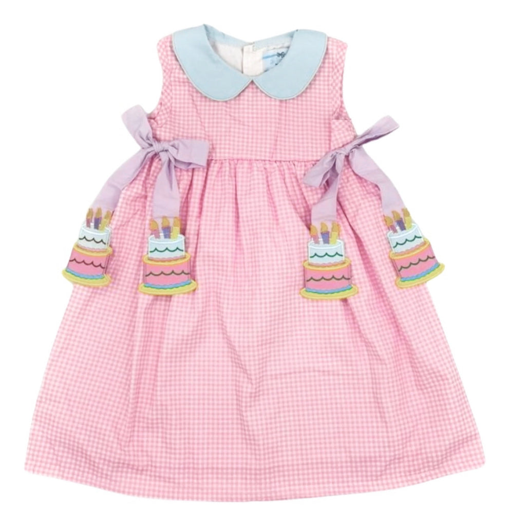 Celebrate in style with this fun pink gingham Birthday Cake Tie Dress complete with a light blue Peter Pan collar and adorable lavender side bows. Colorful birthday cake hang tags add a delightful touch, making it the perfect outfit for the birthday girl or party attendee. Need a matching little sister outfit? Check out our Birthday Cake Tie Bloomer Set.