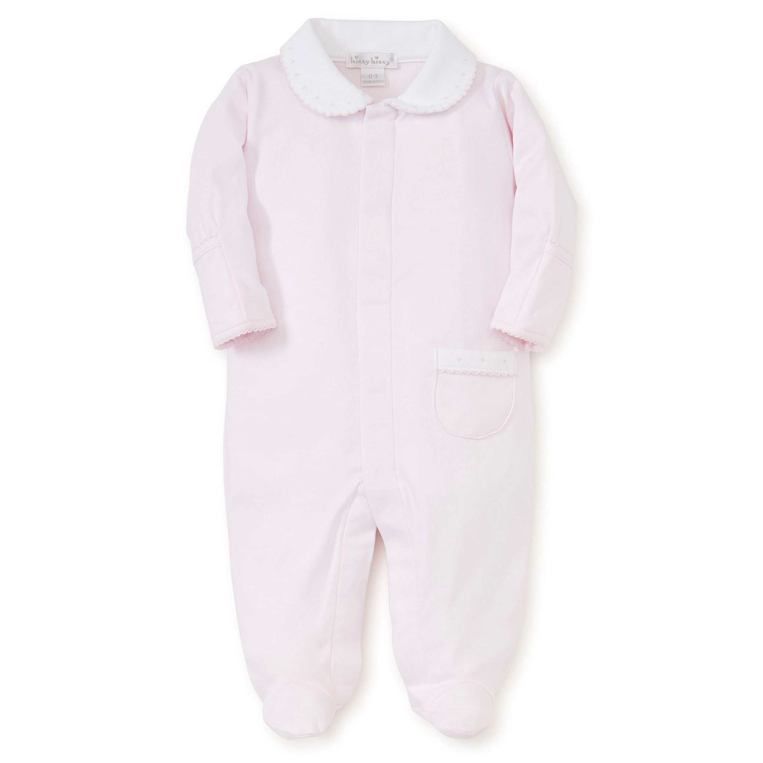 Kissy Kissy Baby Girl's Light Pink New Beginnings Footed Playsuit. Light pink cotton footie with a point collar and patch pocket. Embroidered scalloped trim on the pocket and collar. 100% Peruvian pima cotton.