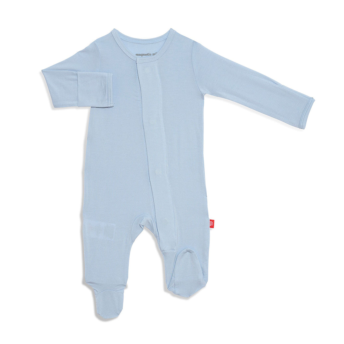 Magnetic Me Baby Blue Footie. A soft, stylish wardrobe staple with smart magnetic fasteners that makes changing time painless. With a no over-the-head design, simply open the outfit and insert baby - the footie practically closes itself.