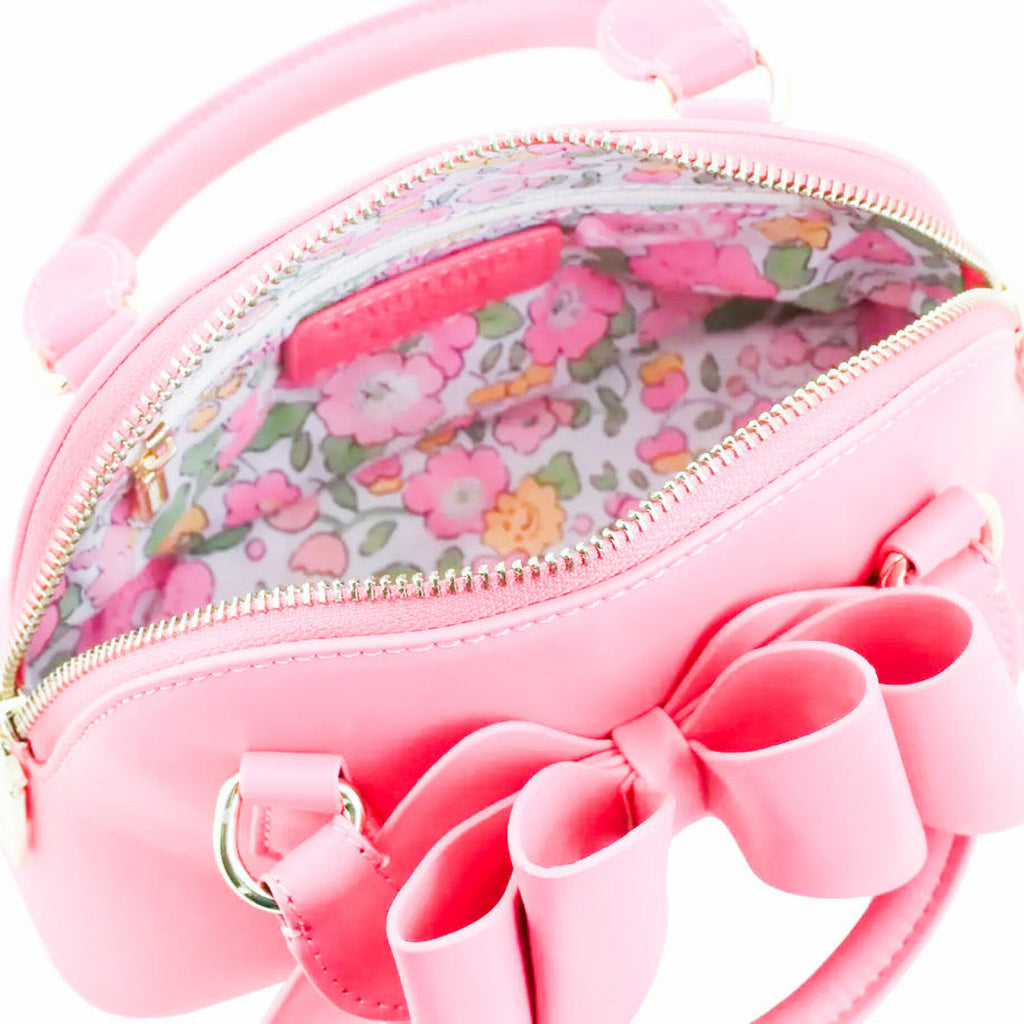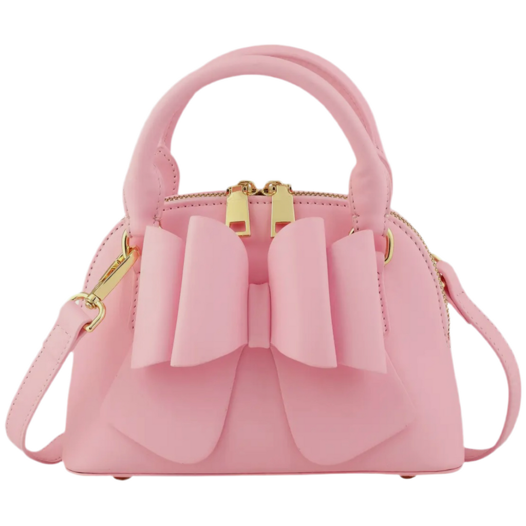 Margo is a playful and stylish purse made from premium pleather, featuring a large bow on the front for a fun statement. This darling light pink purse will definitely complement any little belle's wardrobe. She's designed for both style and functionality with custom floral lining, interior pockets, beautiful gold hardware, and a matching kid-sized crossbody strap!
