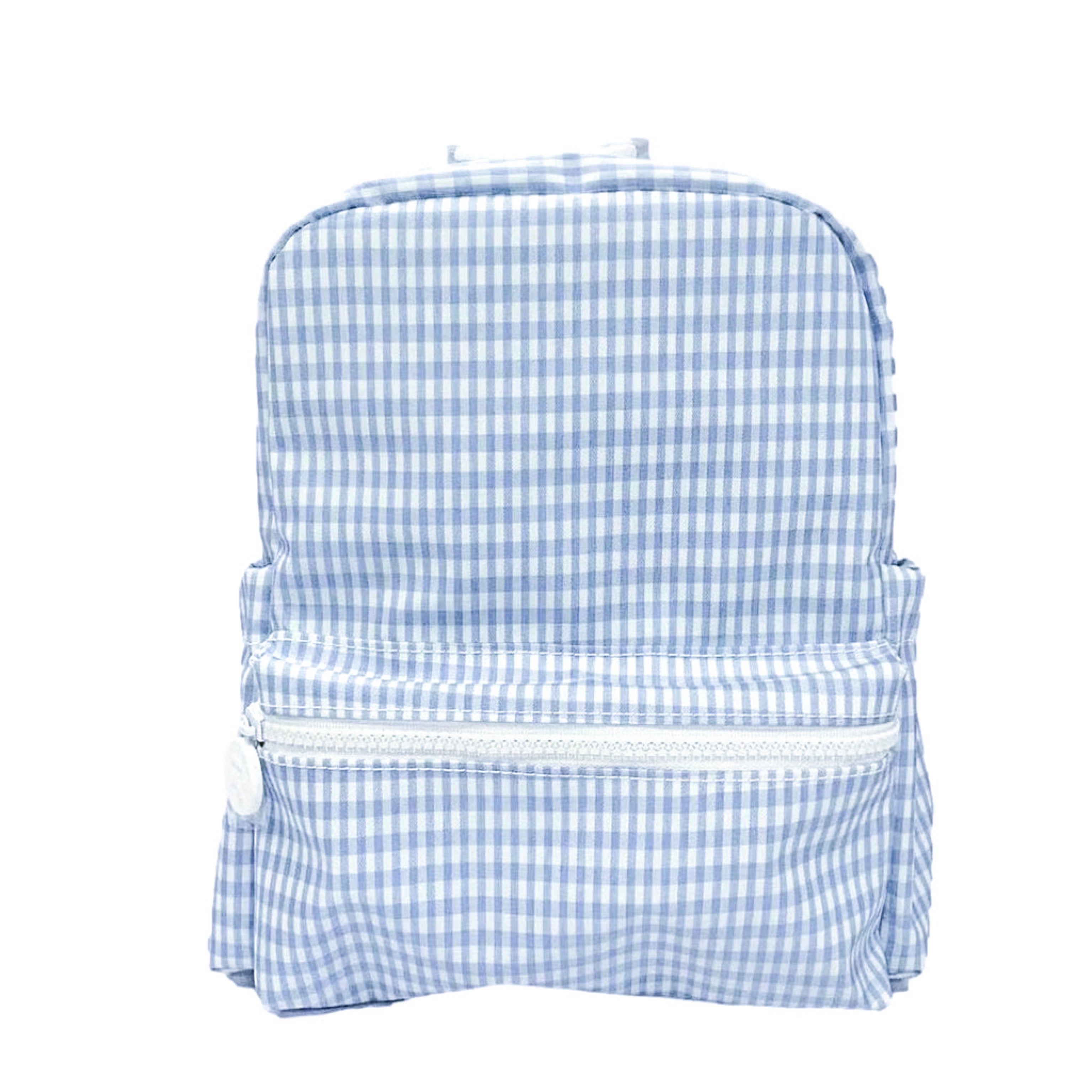 Mist Light Blue Gingham Check Toddler Backpack TRVL Design Mini Backer. Perfect for preschool!!! Soft, lightweight, and water-resistant, this bag is equipped with plenty of room inside and a front zip pocket for supplies. It features adjustable padded straps, side pockets and a convenient top handle that makes it easy to carry. Wipes clean with a damp cloth or machine wash delicate and line dry.