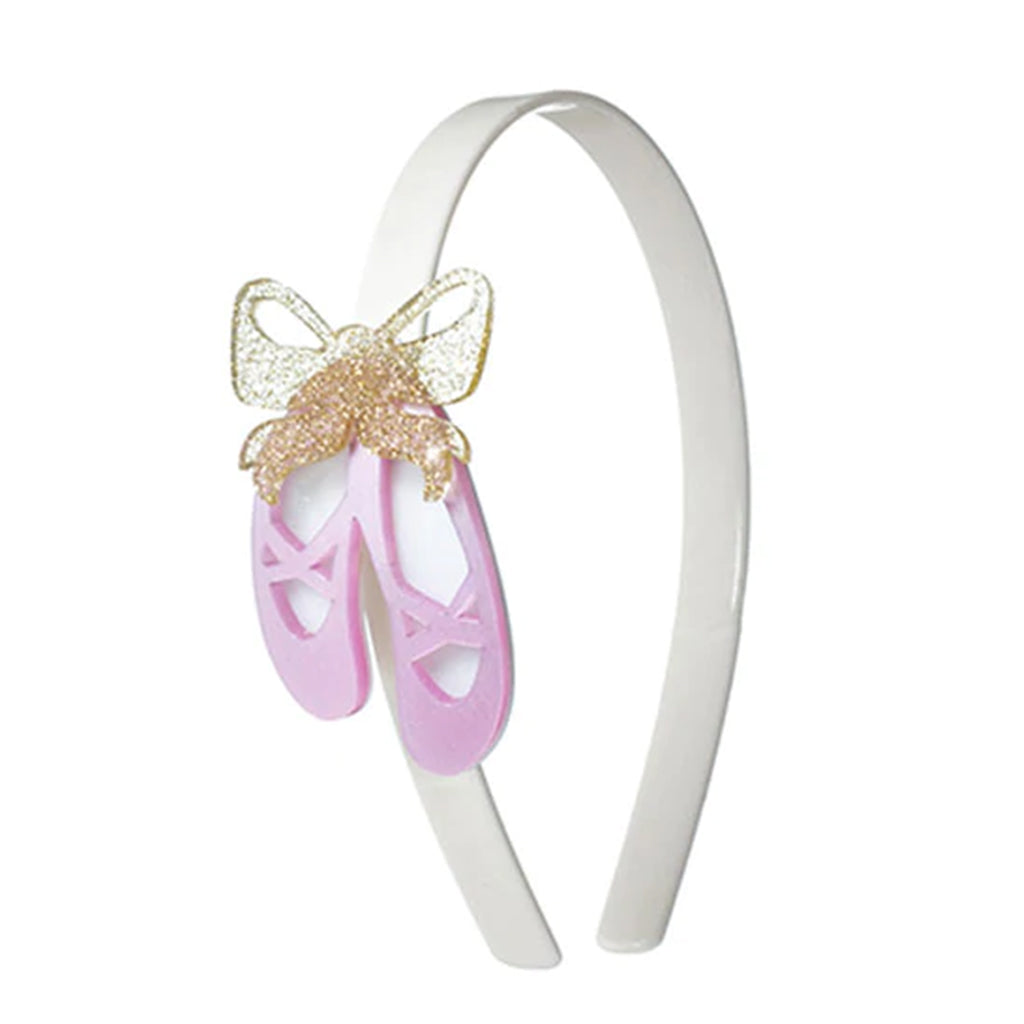 Pink Ballet Shoes Headband by Lilies & Roses. Hold her hair in style with this pretty ballet slipper hair band! Pink with a touch of gold glitter lends color to any girl's hair. 100% acrylic.