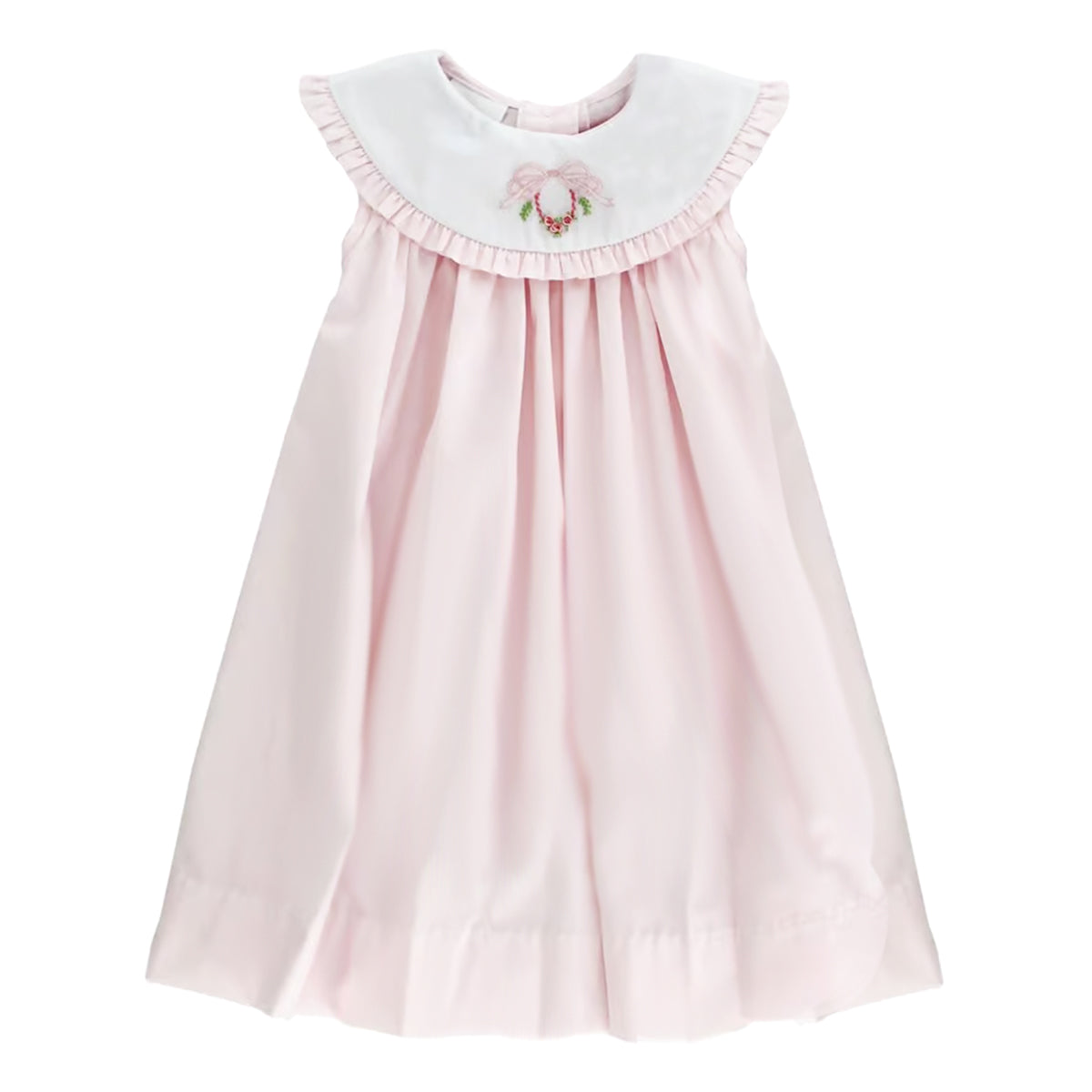 Toddler Girl's Pink Wreath with Bow Float Dress by Bailey Boys. This baby girl's light pink sleeveless dress features a generous skirt and a round white yoke with intricate embroidery.